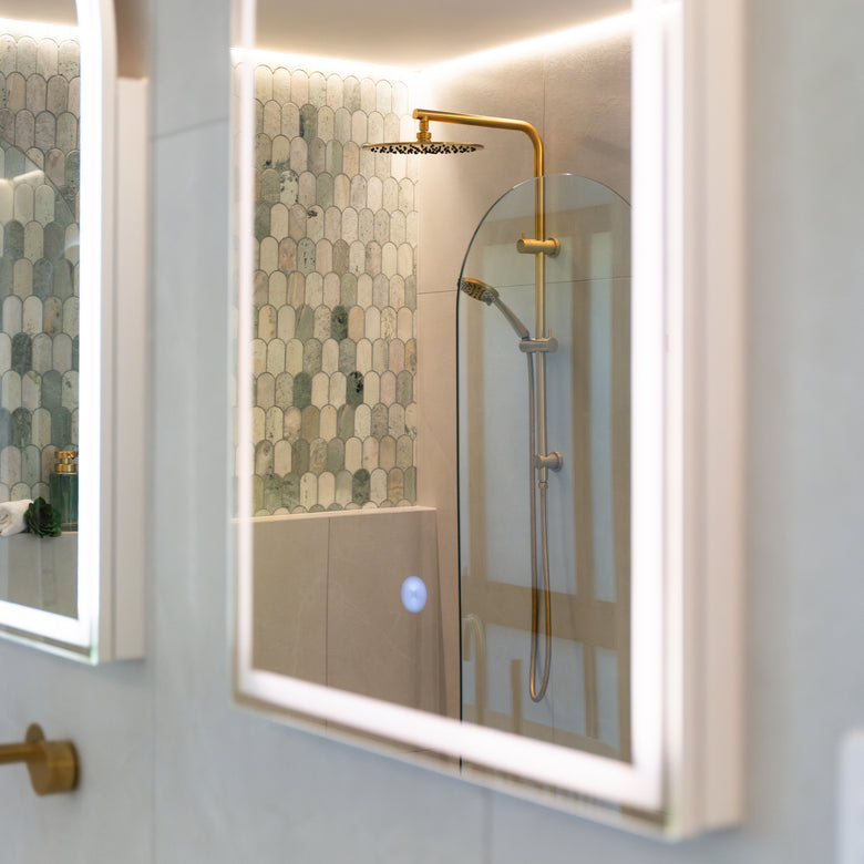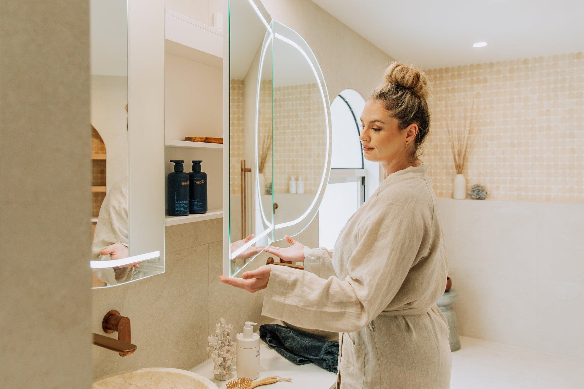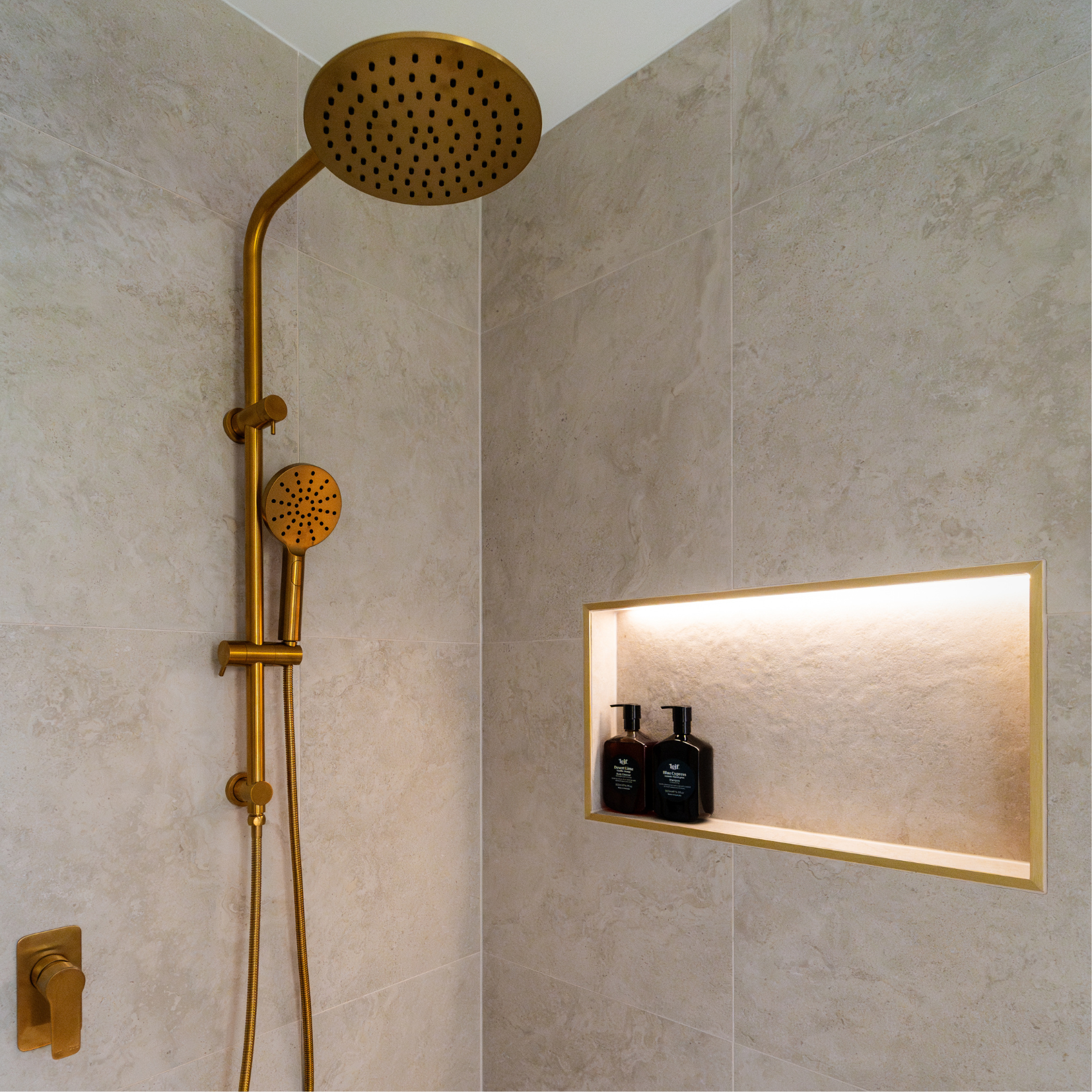 Lighting in both mirrors and niches are user-friendly and add to the design by reintroducing brightness to the spots that need it most.