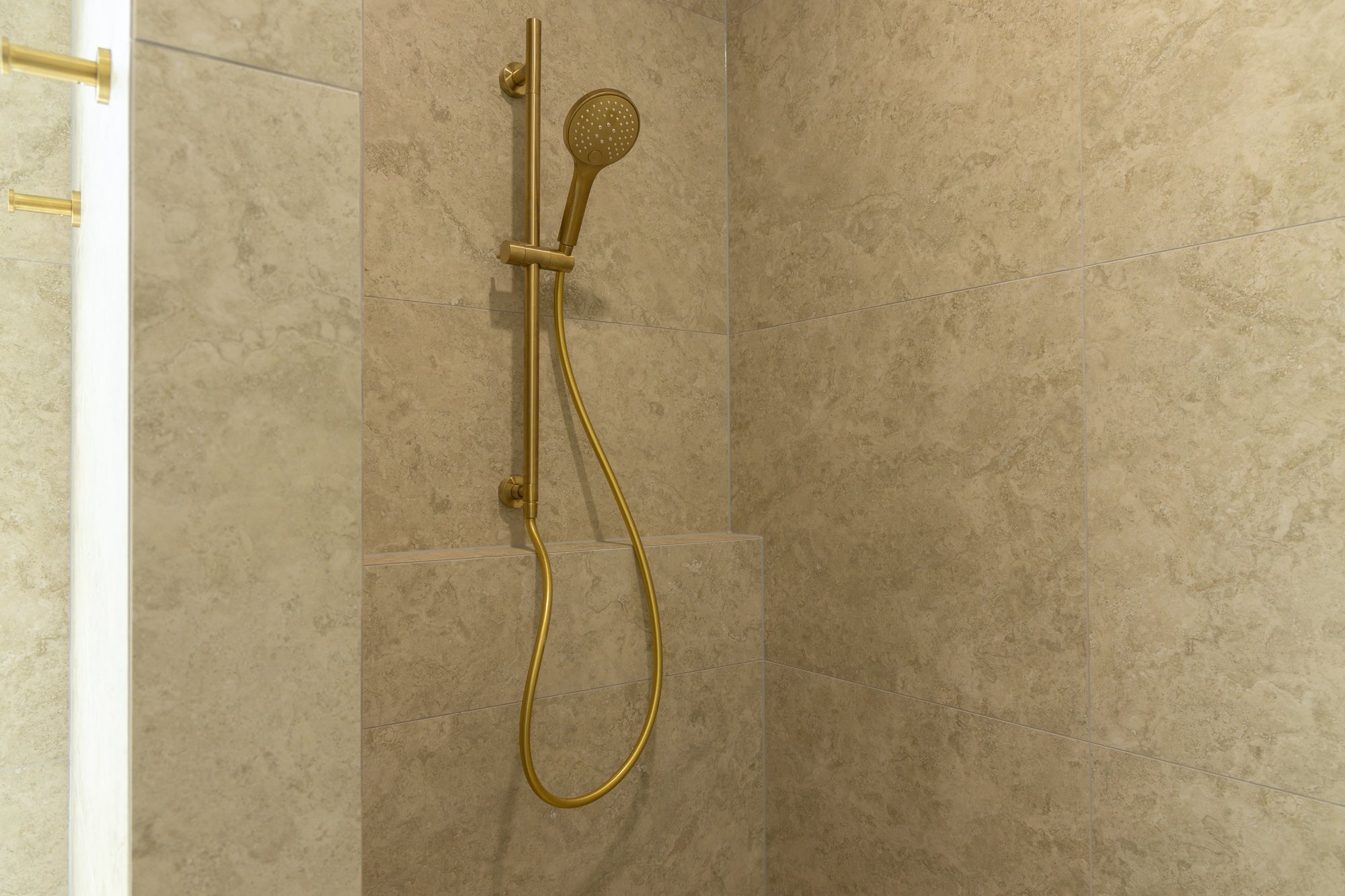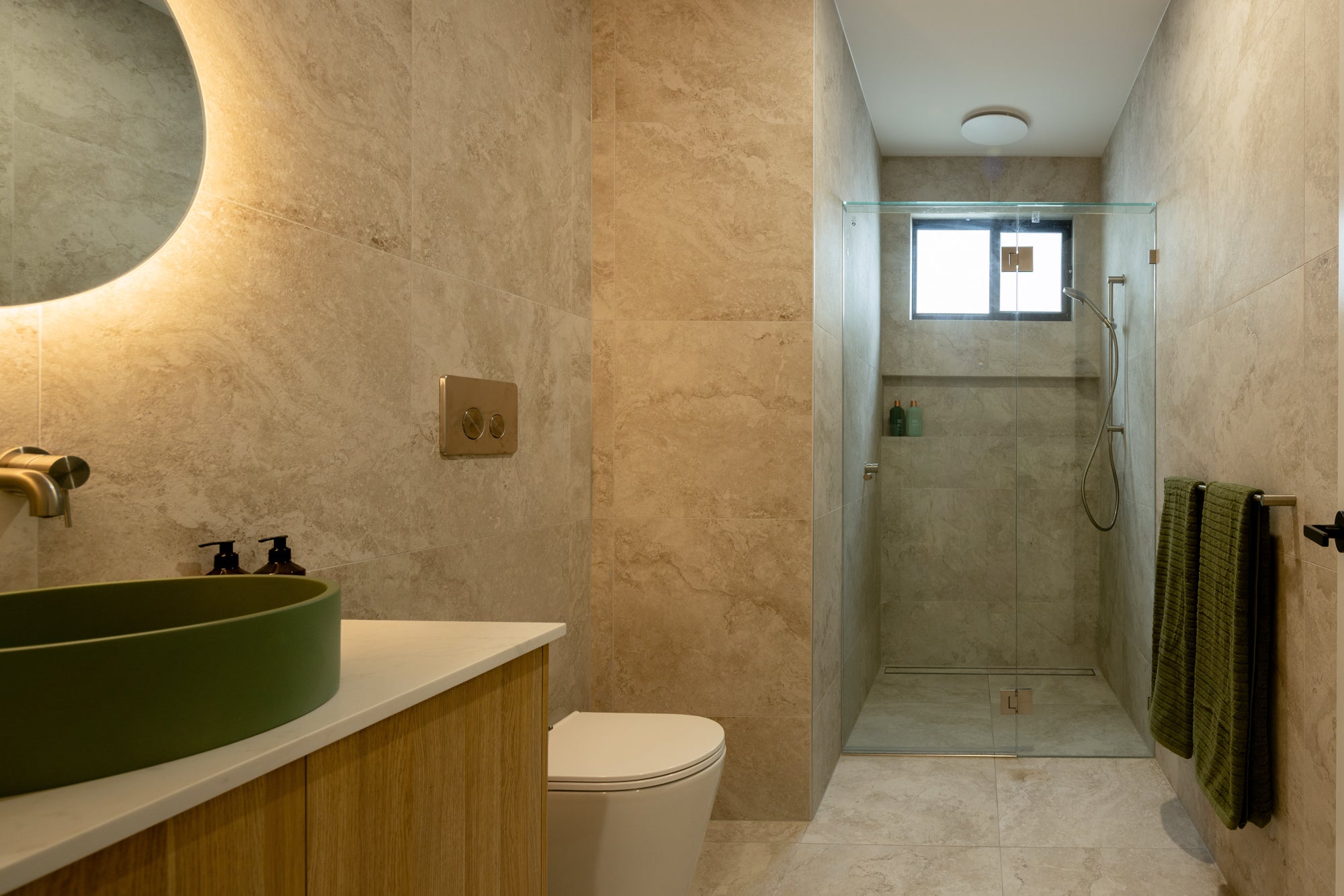 Other bathrooms in the same home take the opposite approach, using a single tile across all surfaces to create a completely immersive, tone-on-tone feel. Both methods work, it’s simply about reading the room. In spaces with wide, uninterrupted walls, contrast helps add interest; in smaller or more enclosed rooms, drenching the space in one material enhances calm and cohesion.