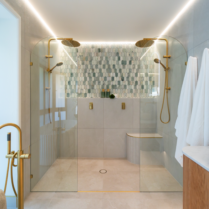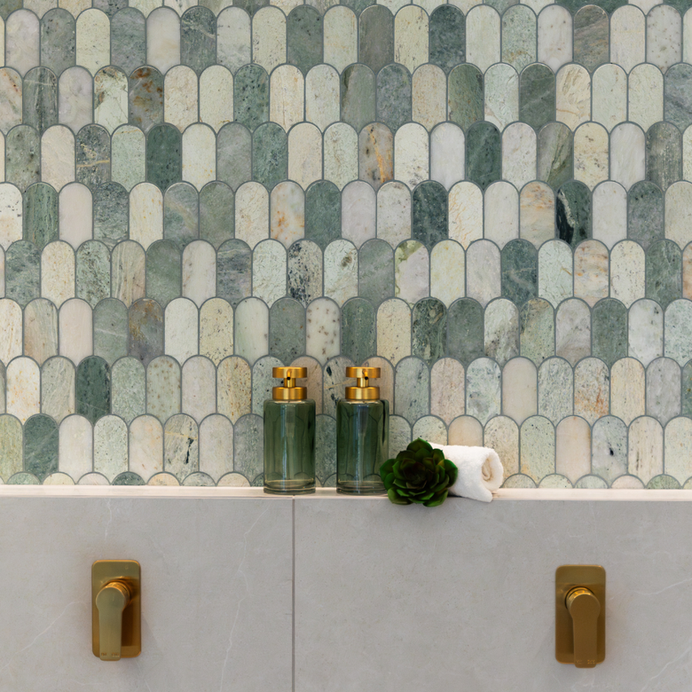 This bathroom layers curved elements across every touchpoint from the rounded vanity and fluted bathtub to the curved shower seat, tapware lines and the mosaic fish-scale feature wall. Together, these shapes guide the eye gently through the space, making the room feel more welcoming and considered.