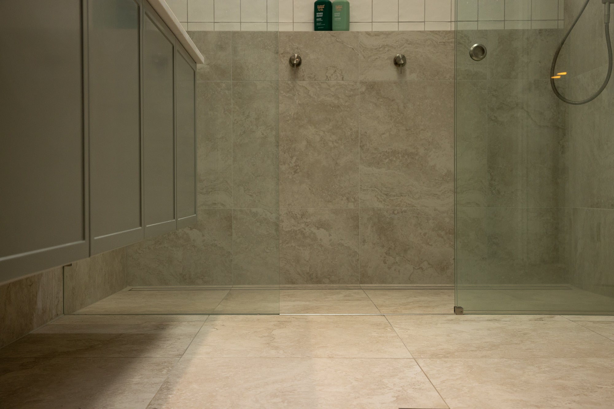 Using the same, large-format tiles from floors to walls 'colour drenches' the room and encases it in modern stone-look feels.