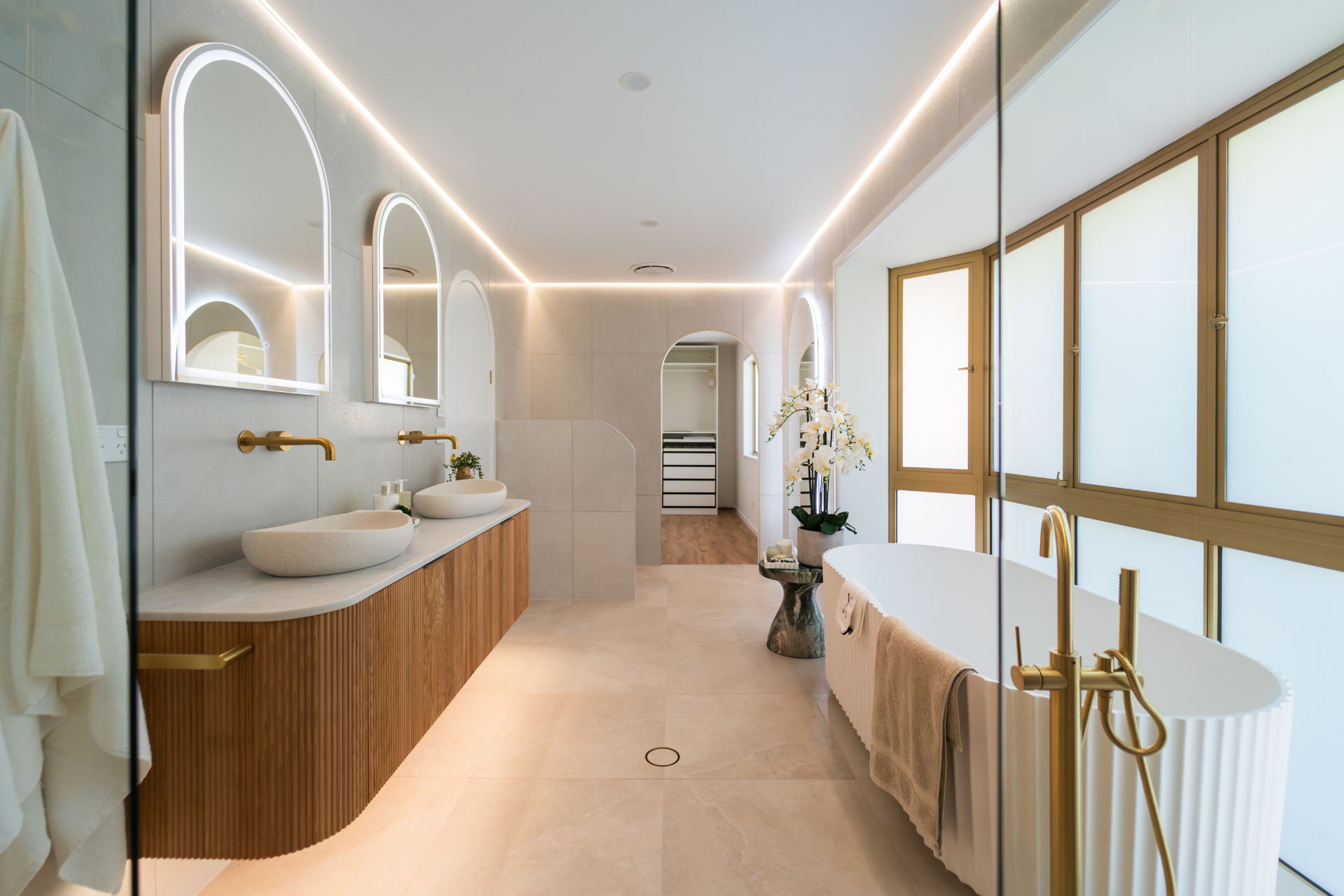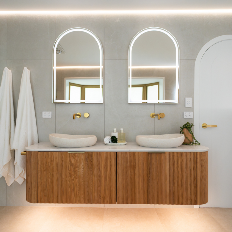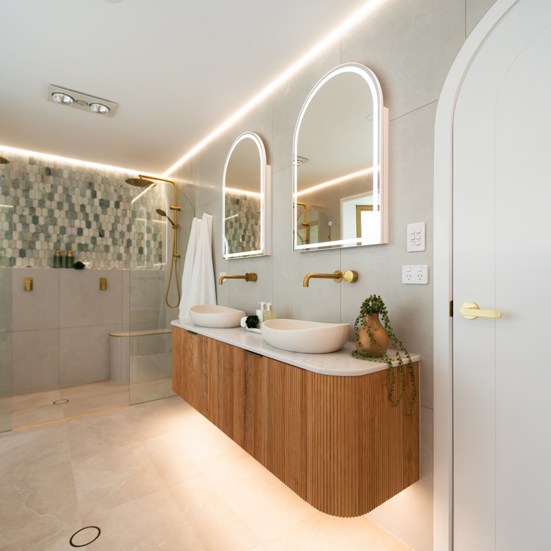 From the moment you step into this bathroom, you’re met with a visual rhythm of rounded forms and warm light. A long double vanity—clad in ribbed timber with soft-edge detailing—anchors the room with a sense of natural ease. Floating above creamy stone-look floor tiles, the vanity almost levitates, illuminated from beneath with a soft glow that highlights the gentle veining underfoot.