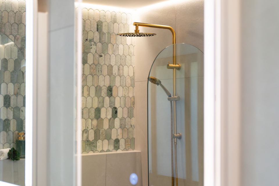 In the shower and wet area, XBathrooms have introduced an arresting feature tile that elevates the entire palette — Ming Green Arch Mosaics. These scalloped marble tiles curve in soft fan shapes across the upper wall, their pale green hues shifting from mint to sage to emerald.