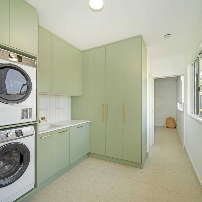 A neutral colour palette is one of the most popular choices for laundry spaces because it creates a timeless base that won’t date. To keep a neutral laundry from feeling flat, mix up your finishes and textures. On the floor, light-coloured matte or honed tiles brighten the space and reduce glare, while glossy splashback tiles bounce light around to make compact laundry rooms feel larger.