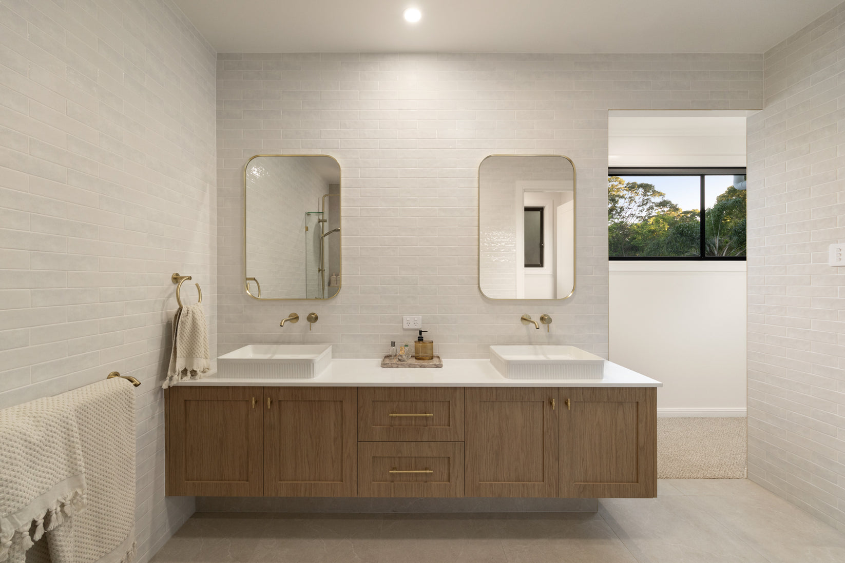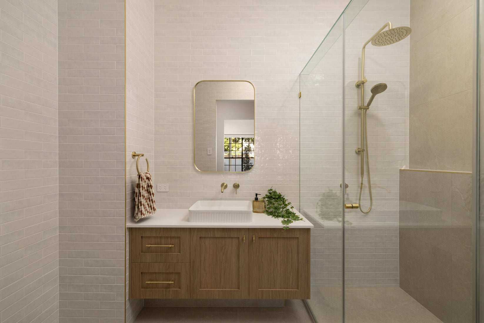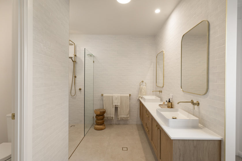 A fresh take on the modern farmhouse aesthetic - where natural texture, tonal balance, and timeless materials create calm, connected spaces. This beautifully detailed home pairs soft gloss tiles, warm timber cabinetry, and elegant brass accents to achieve an enduring, design-led finish.