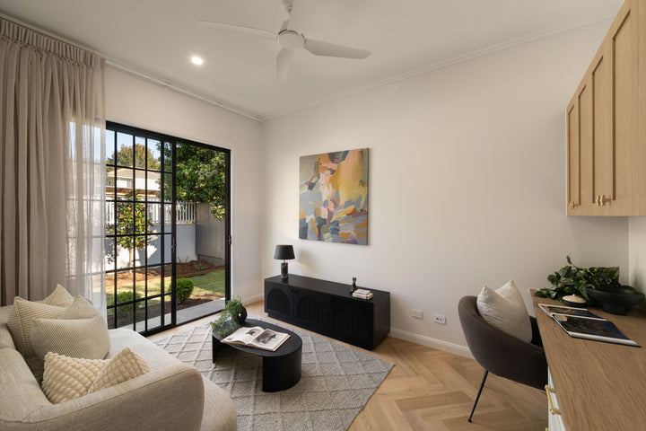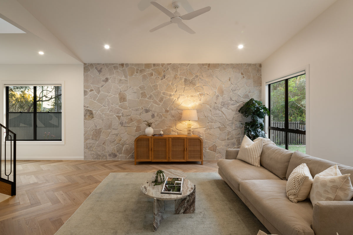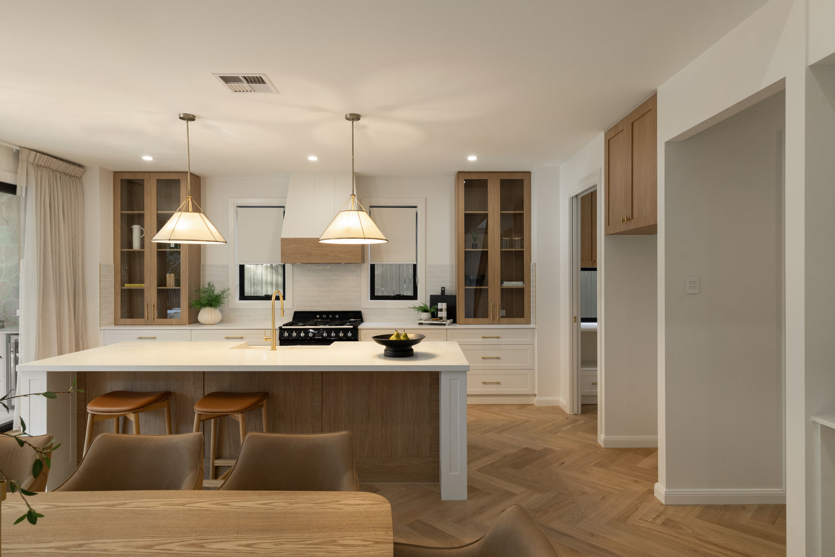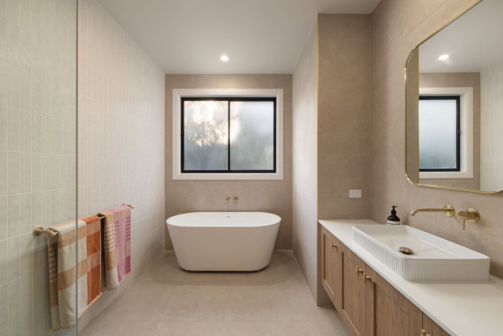 A fresh take on the modern farmhouse aesthetic - where natural texture, tonal balance, and timeless materials create calm, connected spaces. This beautifully detailed home pairs soft gloss tiles, warm timber cabinetry, and elegant brass accents to achieve an enduring, design-led finish.
