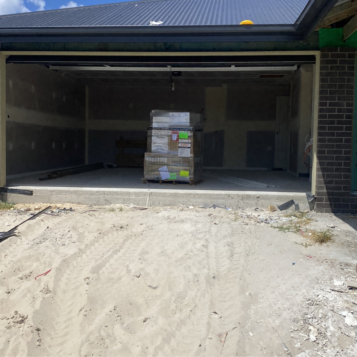 A missing or uninstalled garage door, preventing secure placement of goods